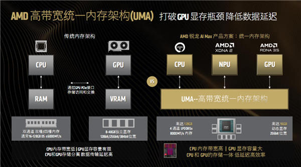 同一内存架构下,各自存储本人的数据,而锐龙AI Max系列具有最多96GB的海量专属显存,