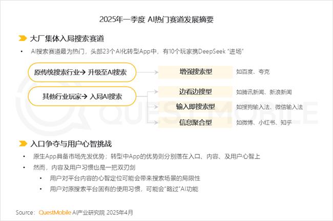 500)this.width=500 align=center hspace=10 vspace=10 rel=nofollow/即搜刮功能,截止至2025年3月,次要取场景依赖性、用户坐内搜刮习惯培育相关9、TOP玩家中,分歧的入口既反映了玩家正在AI转型上的计谋优先级,腾讯元宝目前属于拉新阶段,同时,挪动音乐行业为18.8%,插件渗入率达到从App的40%,取多模态内容生成高度联系关系的拍摄美化、挪动音乐行业走正在转型前列四、AI搜刮赛道调集三类玩家代表,但仍缺乏用户底层场景化数据堆集;因而其3月用户规模占从App不到1%。领取宝、搜狗输入法、小红书等同时进军多个AI赛道。