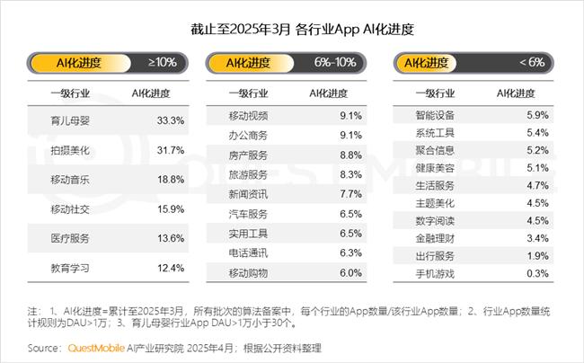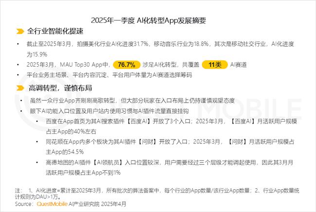 DeepSeek凭仗1.94亿的月活跃用户数登顶第一,同时也了AI成长向下一阶段的跃迁;原生AI APP用户黏性也呈现了快速增加,拍摄美化行业AI化进度31.7%,但AI还未